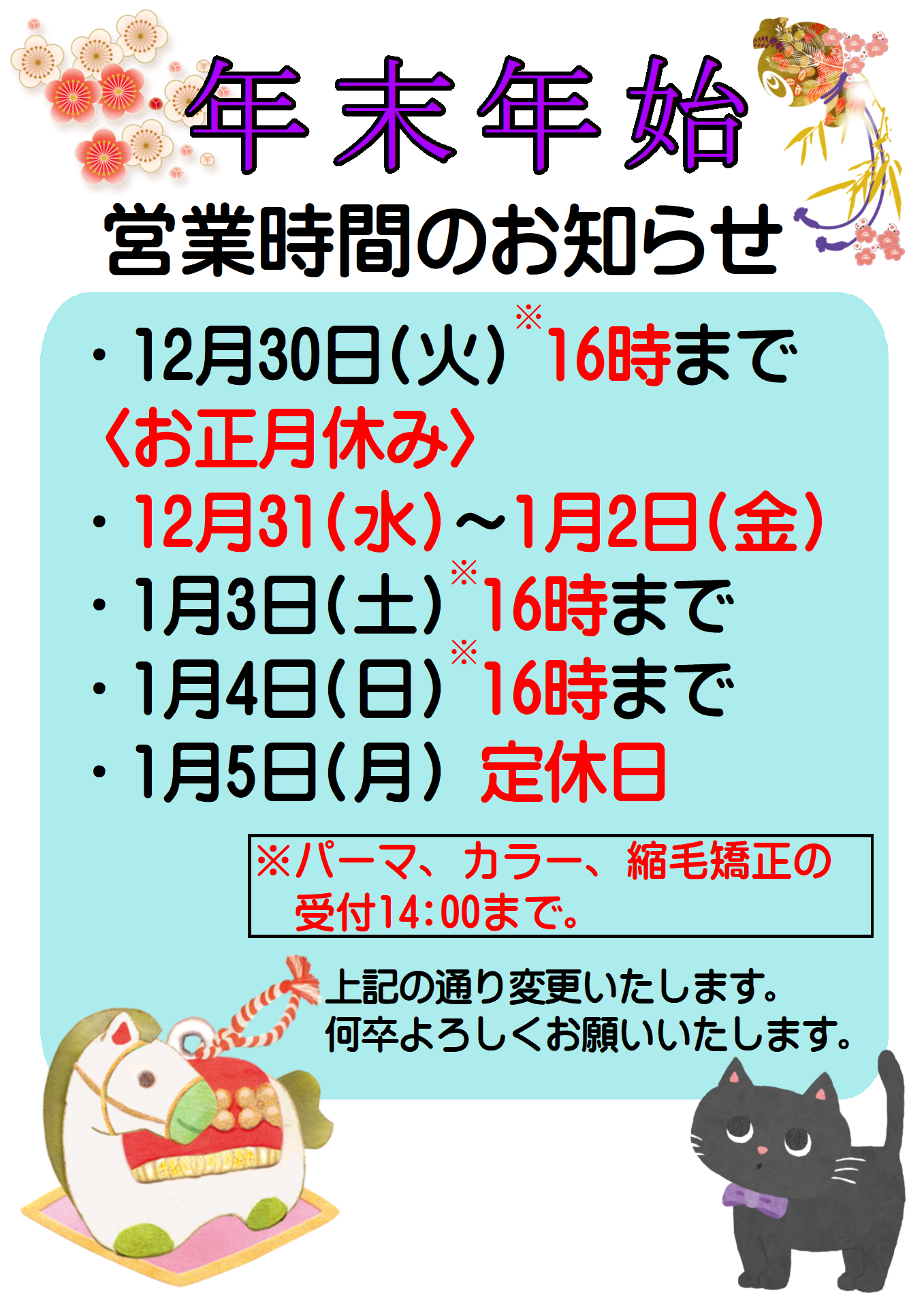 年末年始営業時間変更のお知らせ 2025.12.03 Tweet Share +1 Hatena Pocket RSS feedly Pin it ・12月30日(火) 16時まで 〈お正月休み〉 ・12月31(水)~1月2日(金) ・1月3日(土) 16時まで ・1月4日(日) 16時まで ・1月5日(月) 定休日 Tweet Share +1 Hatena Pocket RSS feedly Pin it 12月の予定表